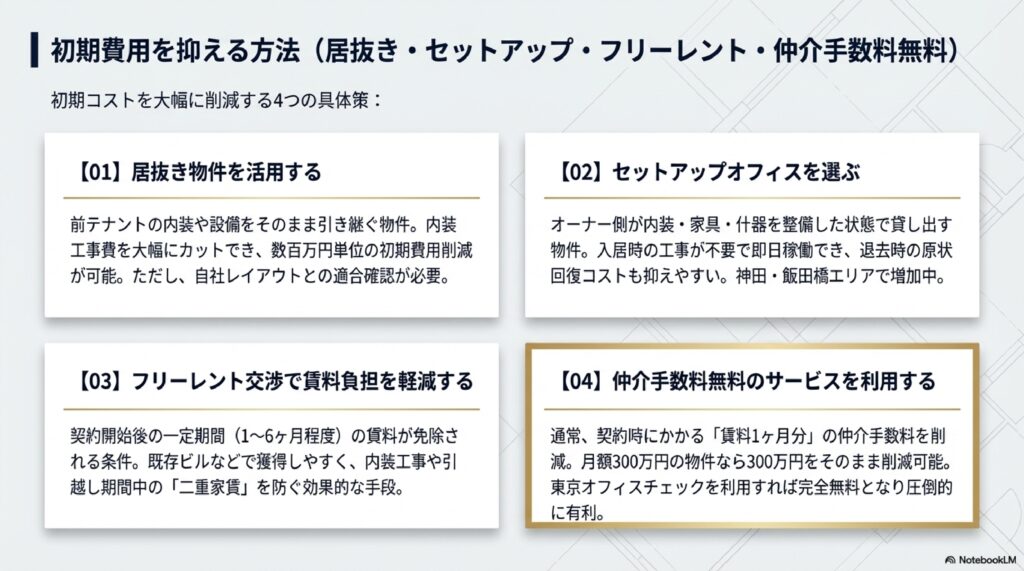 - 居抜き・セットアップオフィス・フリーレント・仲介手数料無料など初期費用を抑える具体策