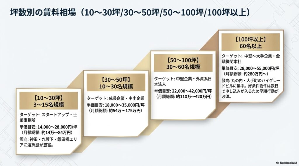 | 坪数帯 | 坪単価の目安 | 月額賃料の目安 | 想定される企業規模 |