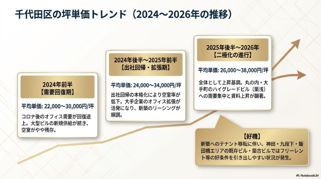 | 2025年後半〜2026年 | 26,000〜38,000円/坪 | エリアにより差が拡大 | 丸の内・大手町のハイグレードビルは賃料上昇が顕著。神田・飯田橋の既存ビルとの二極化が進む |