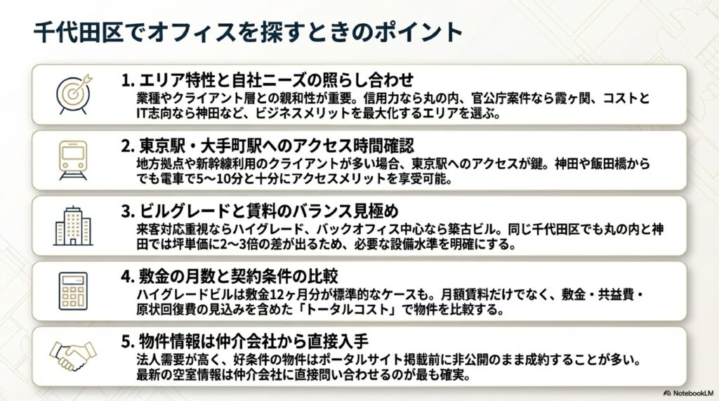 千代田区で賃貸オフィスを探す際に押さえておきたいポイントを5つにまとめます。