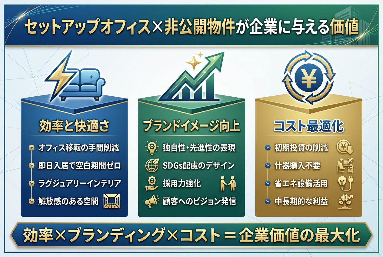 セットアップオフィスと非公開物件の組み合わせは、企業に効率や快適さ、ブランディング力の強化など多くの価値をもたらします。