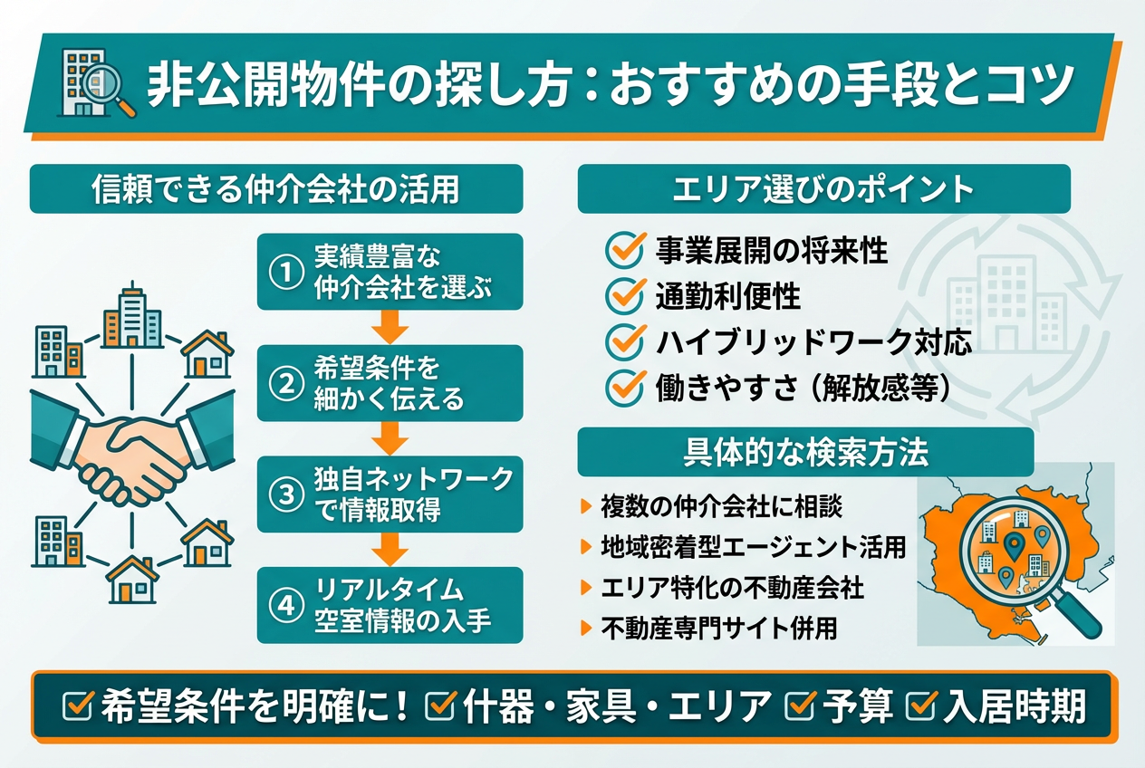 非公開物件は、信頼できる仲介会社とのパートナーシップが何より重要です。実績豊富な仲介会社は、公開されていない希少物件や家具付きオフィスなど、独自ネットワークを活用して紹介してくれます。特に東京エリアやエリア特化対応の業者なら、地域ごとの動向や空室情報もリアルタイムで把握しています。
