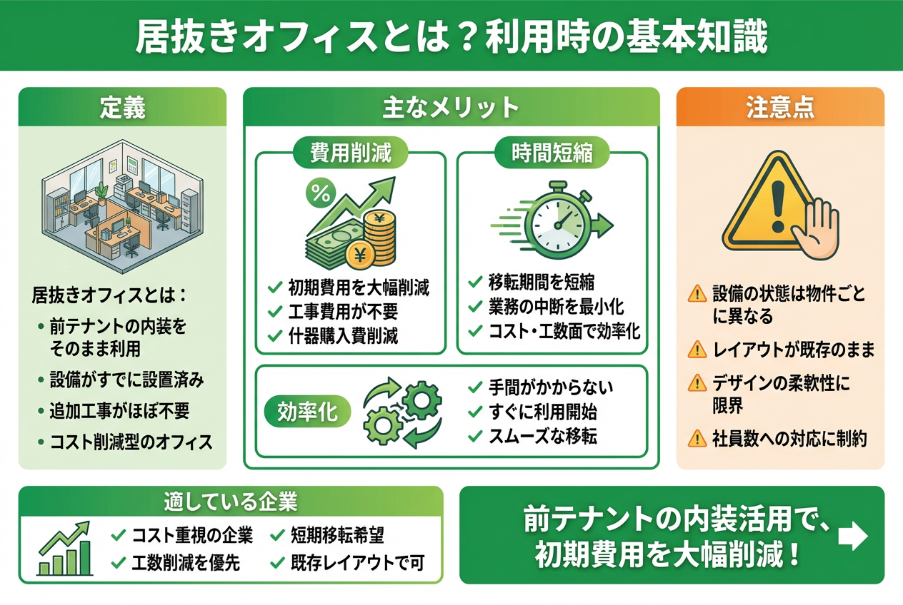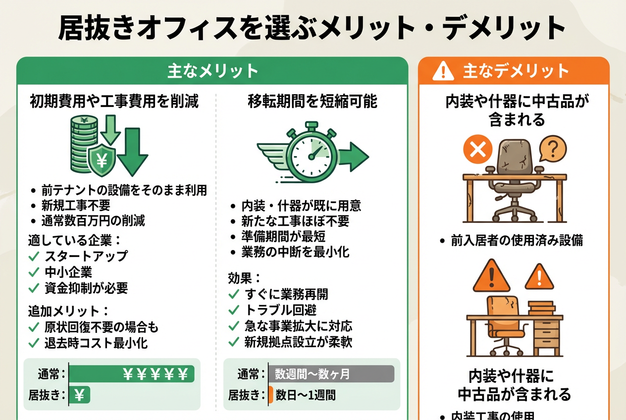 居抜きオフィスは費用と工期で魅力がある反面、設備状態や契約上の注意点も必要です。