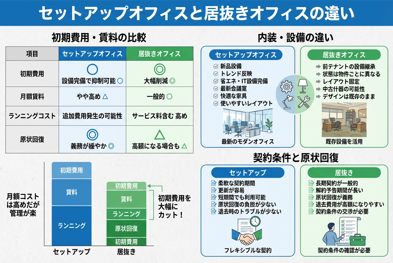 セットアップオフィスは新品設備が整いすぐに利用できるのに対し、居抜きは前テナントの内装や什器を活用する点が特徴です。