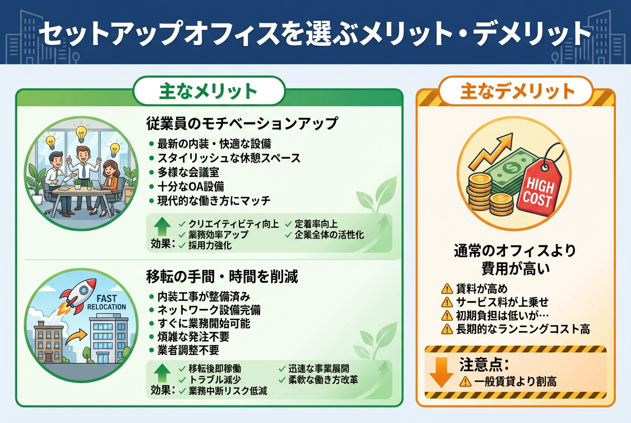 セットアップオフィスのメリットは、業務効率や社員満足度の向上、移転の簡便さです。