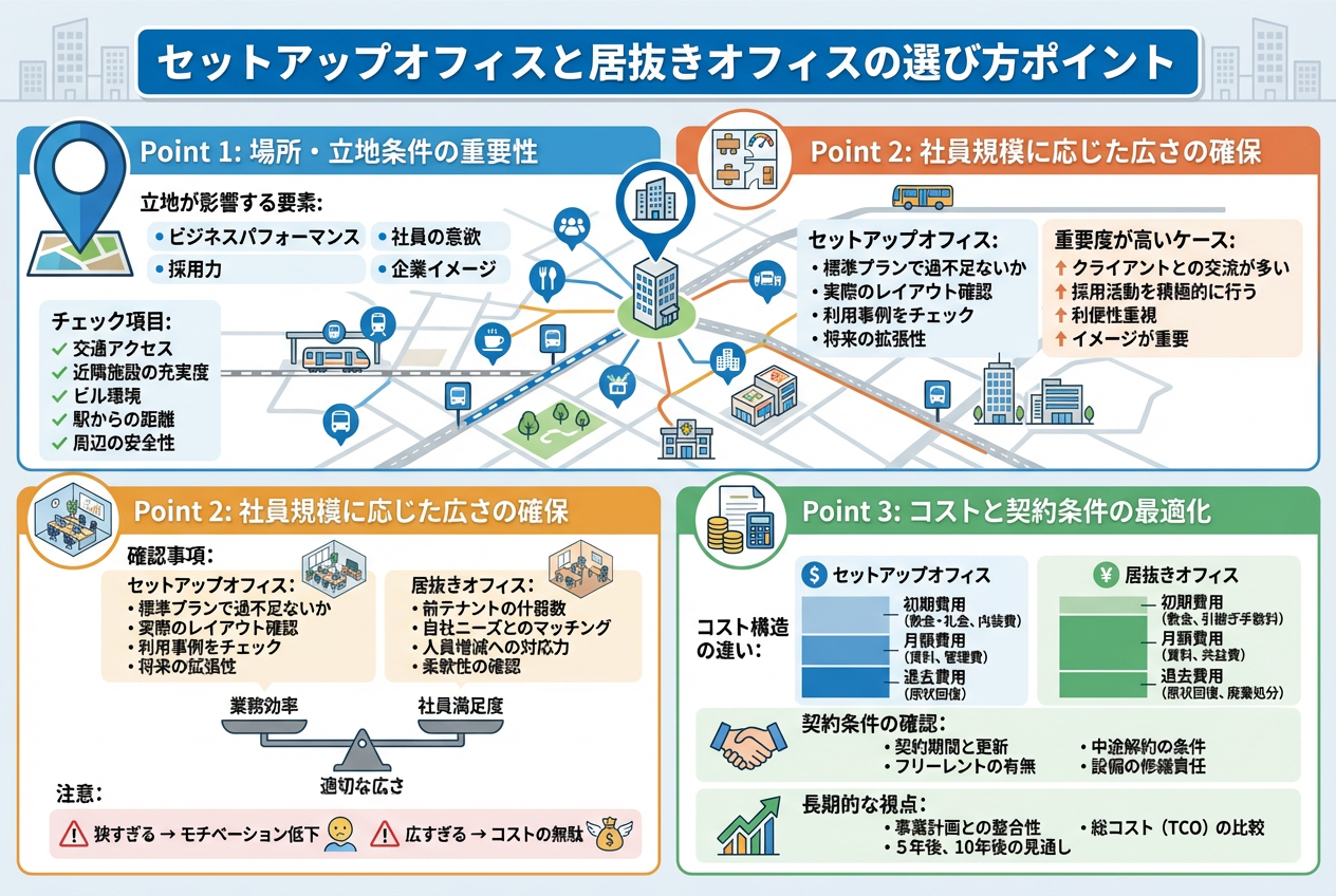 自社の業務内容や成長計画、社員規模や重視したい条件で最適なオフィスを選ぶポイントを押さえましょう。