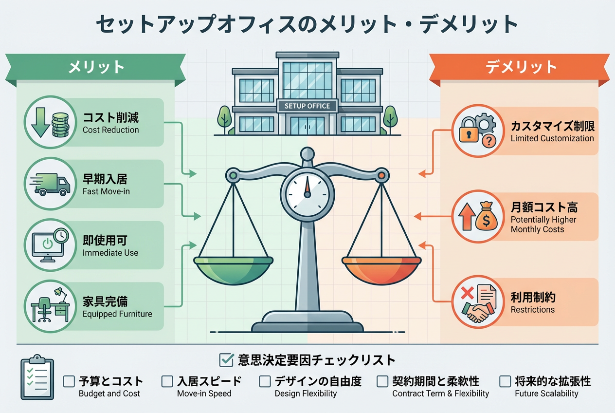 セットアップオフィスには、初期費用削減やスピード感のある開設といったメリットがある一方、自由度の低さや費用の割高感といったデメリットも存在します。
