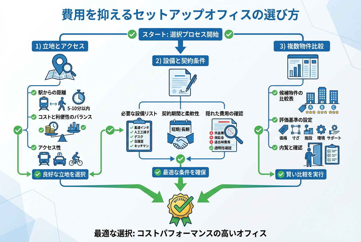 費用を抑えるセットアップオフィス選びでは、立地や物件設備、契約条件、月額費用の内訳など多面的な比較が重要になります。
