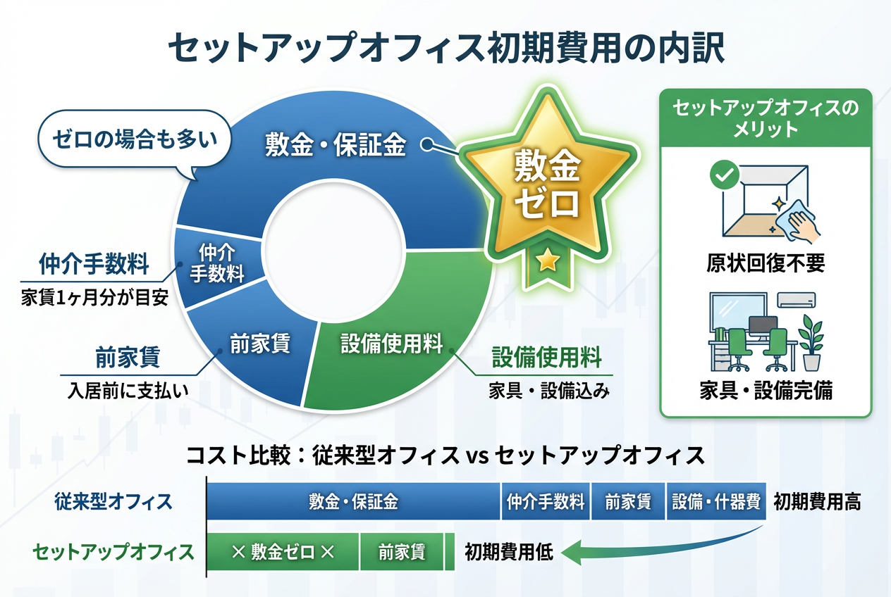 セットアップオフィスの初期費用は、敷金・保証金、仲介手数料、前家賃、設備使用料などが主な内訳です。