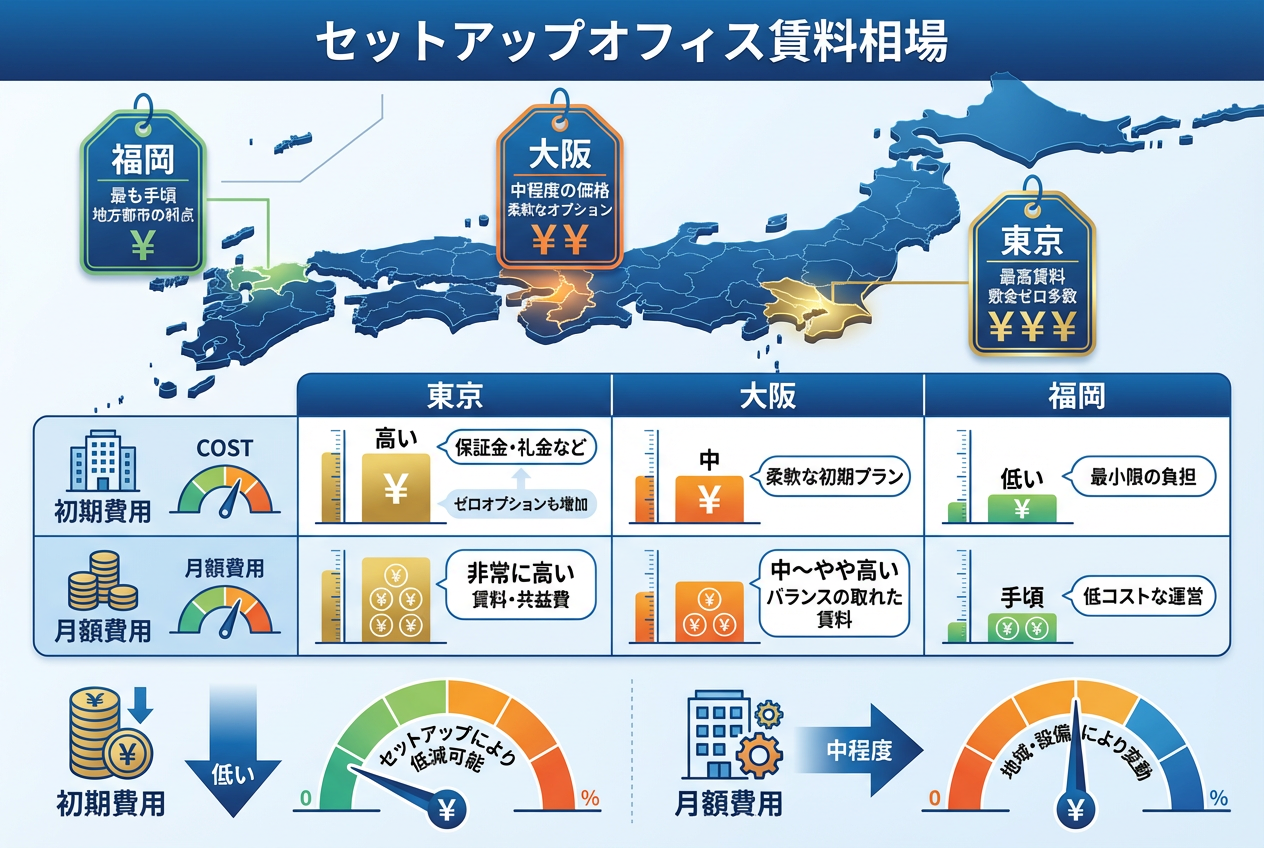 セットアップオフィスの初期費用は、主要都市やエリアによって大きく異なります。東京都心部では賃料が高めに設定されているものの、敷金ゼロや原状回復不要の物件も多く、初期コストは従来の賃貸オフィスよりも抑えやすい傾向です。