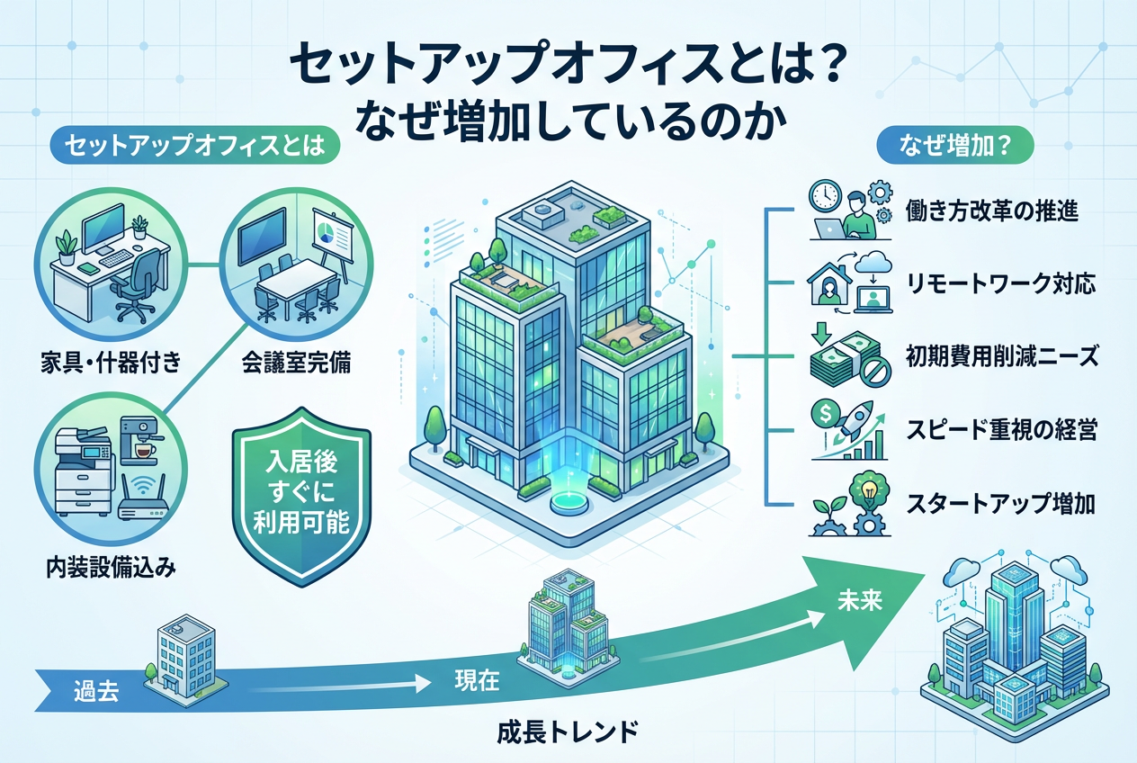 セットアップオフィスは、必要なオフィス家具や什器が最初から用意された、入居後すぐに業務を開始できる物件です。短期間の利用や初期費用削減を実現したい企業に注目されています。