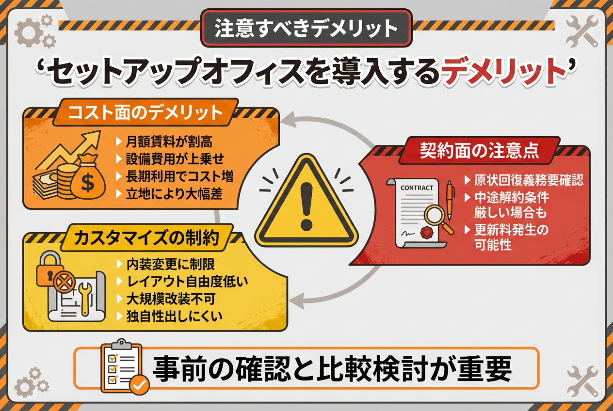 セットアップオフィス利用時は、賃料やカスタマイズ範囲など特有の注意点を把握しておくことが重要です。
