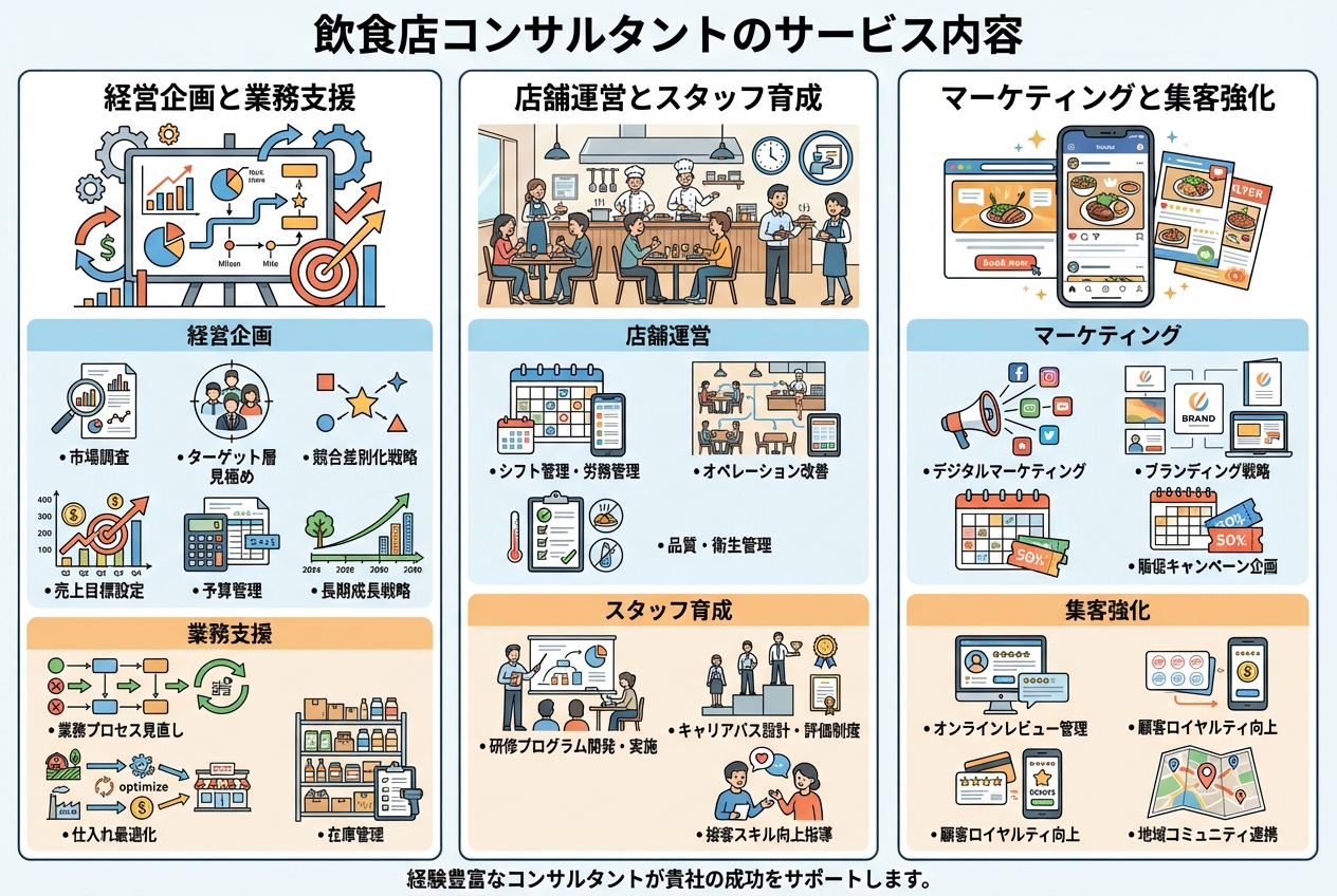 飲食店コンサルタントは、経営企画や業務支援、メニュー開発といった多岐にわたるサービスを提供しています。さらに、従業員の教育や業務効率化もサポートし、経営者が直面するさまざまな課題を解決するための具体的な方法を提案します。