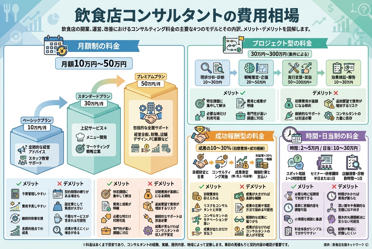 飲食店コンサルタントの費用相場は、契約の内容やコンサルタントの経験によって異なります。以下では主要な料金体系について説明します。