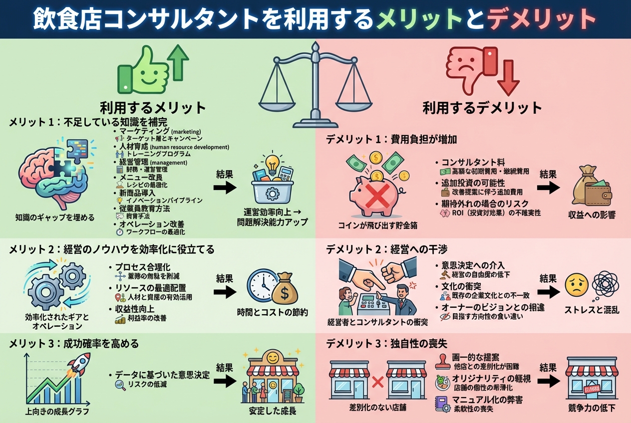 飲食店コンサルタントの利用には、さまざまなメリットとデメリットがあります。ここでは、その具体的な内容を詳しく解説します。経営改善や売上アップを目指す際に、どのような点に着目すべきかを理解するための参考にしてください。