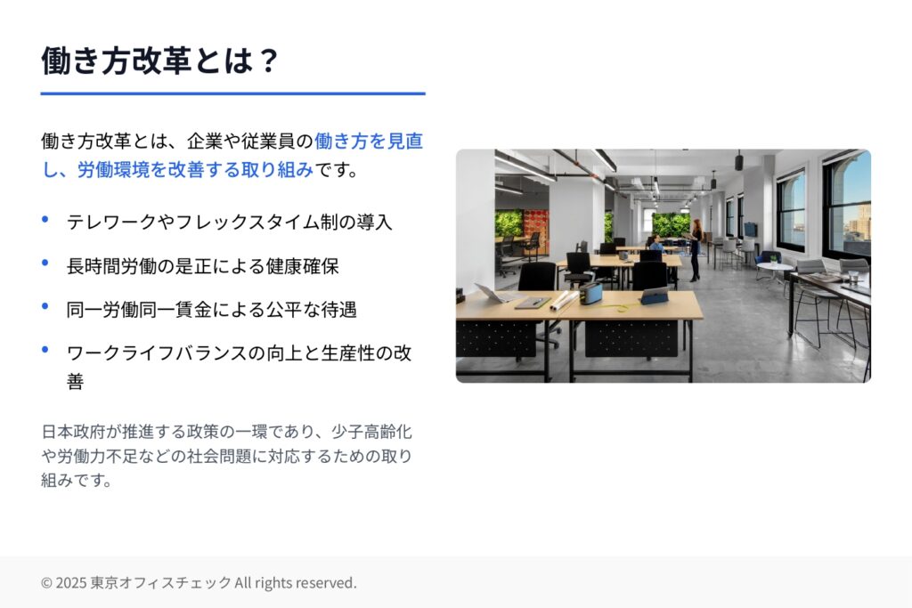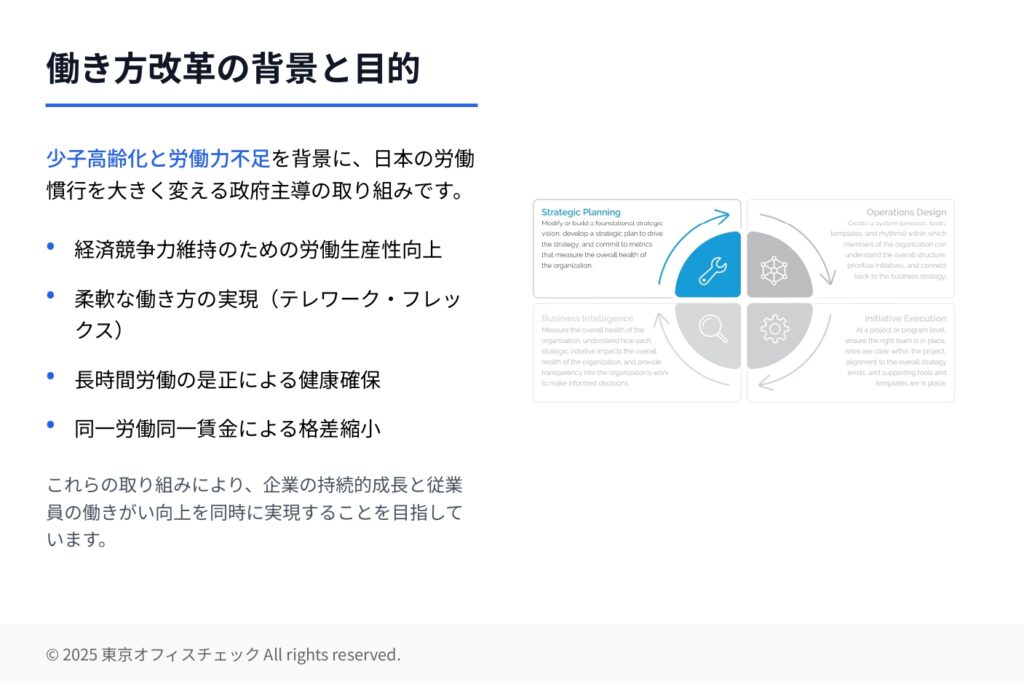 働き方改革とは、企業や労働者の働き方を見直し、労働環境を改善する取り組みのことです。具体的には、テレワークやフレックスタイム制の導入、長時間労働の是正、同一労働同一賃金などが含まれます。これにより、労働者のワークライフバランスを向上させ、企業の生産性を高めることを目指しています。この改革は、日本政府が推進する政策の一環であり、少子高齢化や労働力不足といった社会問題に対応するための重要な取り組みとなっています。働き方改革の背景と目的