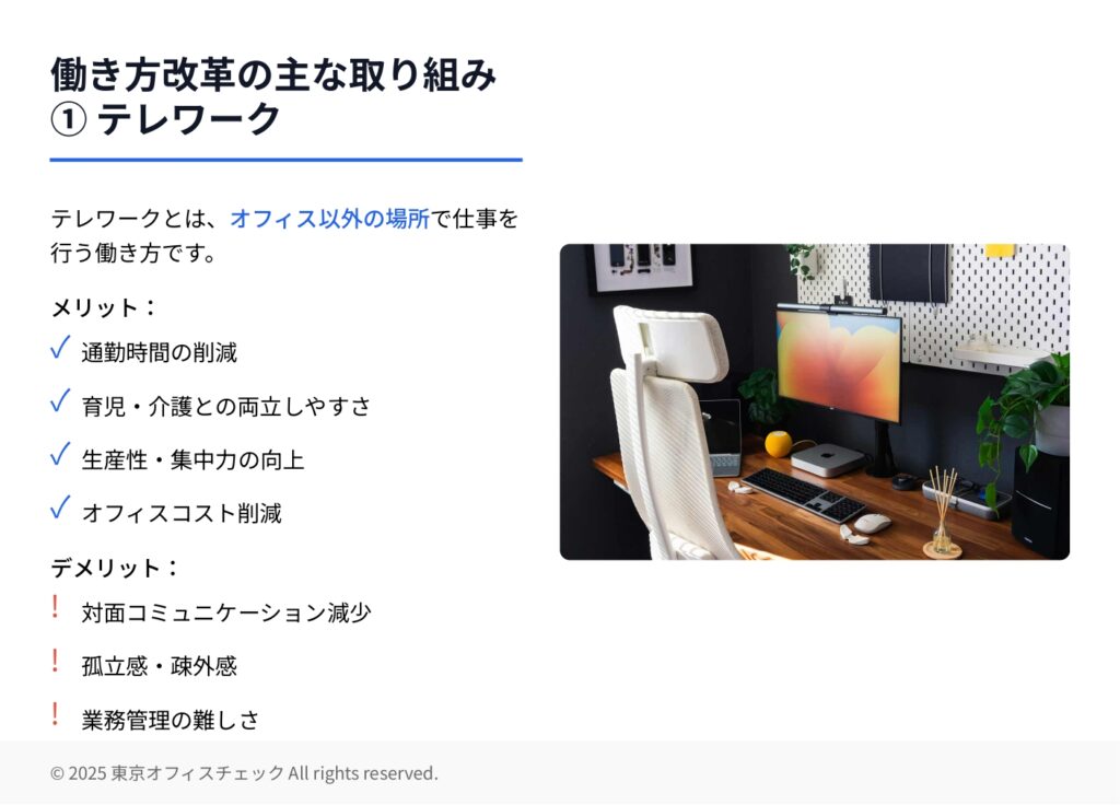 働き方改革は、企業の生産性向上や労働者のワークライフバランスの改善を目指す取り組みとして注目を集めています。しかし、その施策には多くのメリットとデメリットが存在し、企業や労働者にとってどのような影響があるのかを理解することが重要です。この解説記事では、働き方改革の背景や目的、具体的な取り組み、企業および従業員にとっての利点と課題について詳しく掘り下げ、実際に導入する際のポイントも併せて紹介します。この記事を読むことで、働き方改革の全体像が把握でき、適切な意思決定に役立つ情報を得ることができます。企業の経営者や人事担当者、そして働き方改革に関心を持つ全ての方々にとって、必要な知識が満載です。