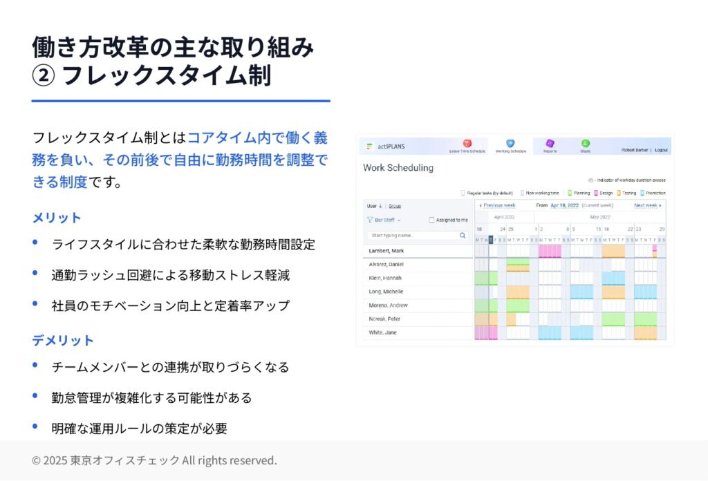 ただし、フレックスタイム制には一定のデメリットもあります。例えば、チームメンバーとの連携が取りづらくなったり、管理が難しくなることがあります。そのため、制度導入の際には、しっかりとした運用ルールや管理体制の整備が不可欠です。