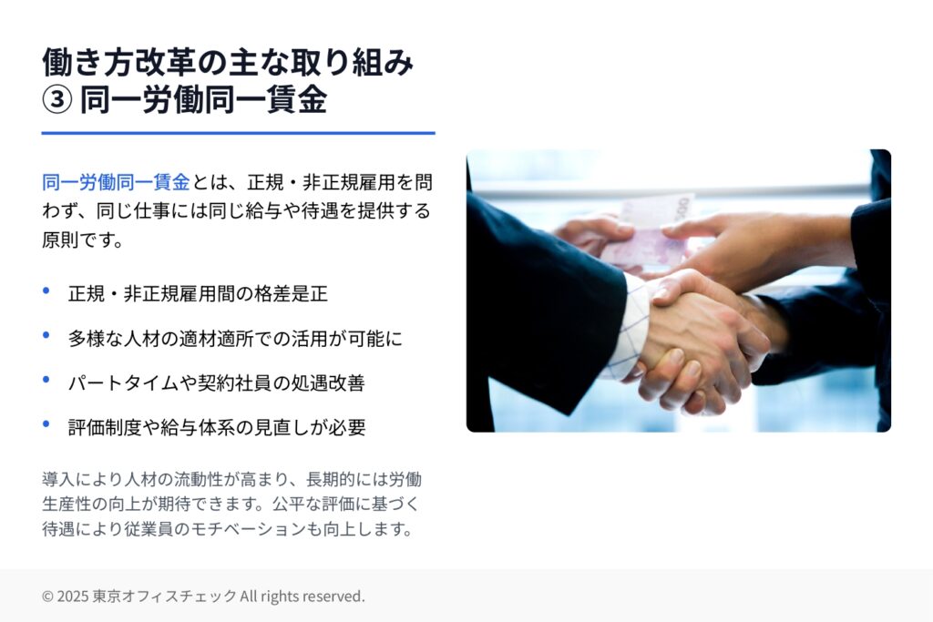 同一労働同一賃金の原則は、同じ仕事をする労働者に対して同じ給与や待遇を提供することを目的としています。この取り組みは、パートタイムや契約社員などの非正規雇用者と正規雇用者の間で生じる待遇の不公平を解消するために重要です。