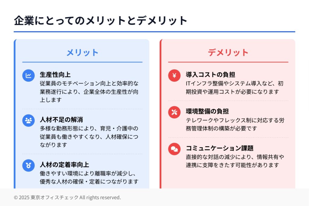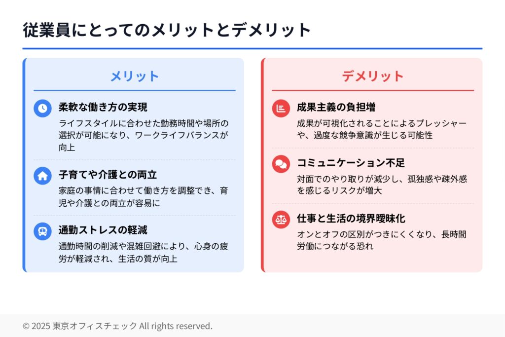 従業員にとってのメリットには、ワークライフバランスの向上や自己実現の機会増加があります。