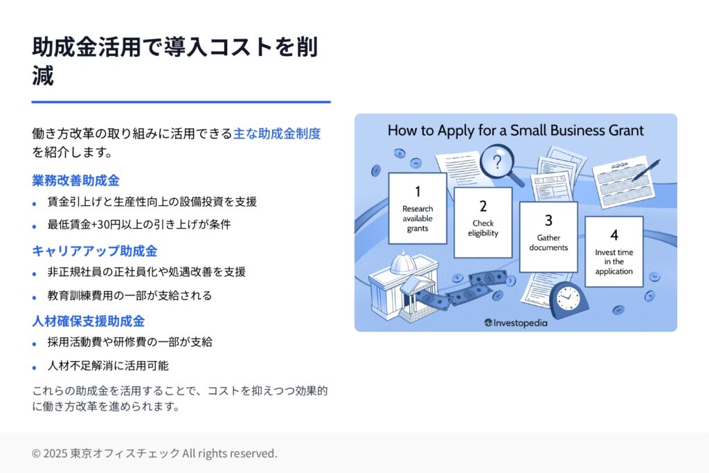 これらの助成金をうまく活用することで、企業はコストを抑えつつ、働き方改革を推進することができます。