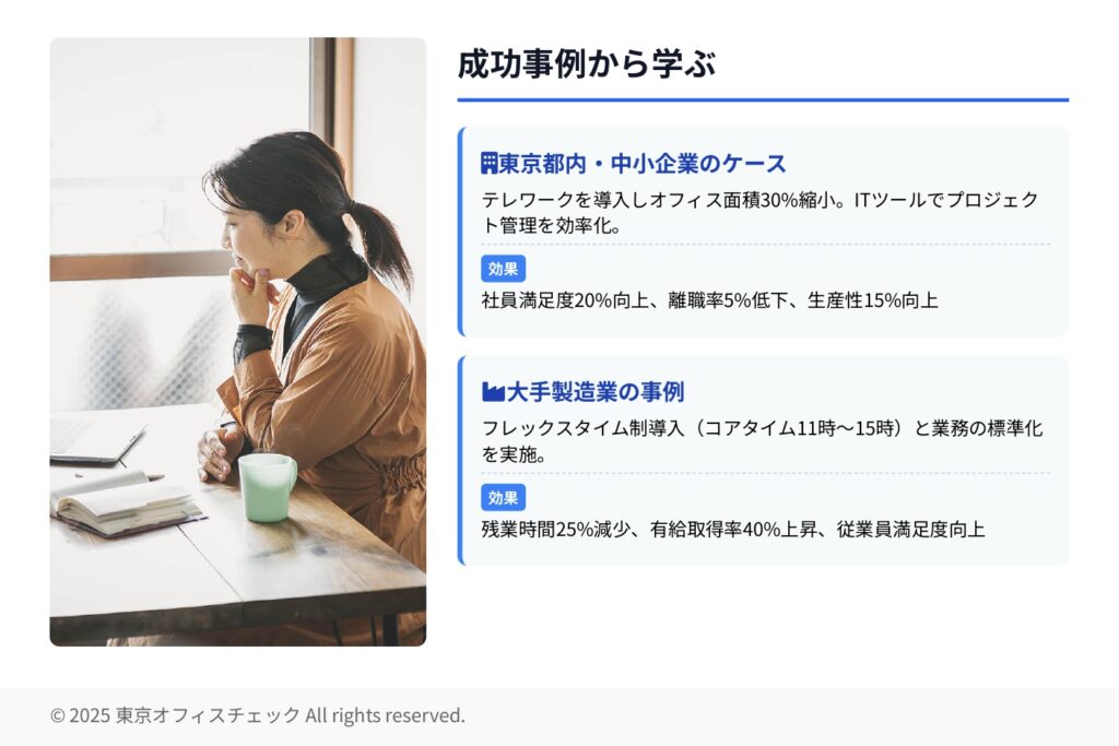 これらの成功事例を通じて、働き方改革が企業の生産性向上や社員の満足度向上に寄与することが確認できます。自社の状況に合った働き方改革の取り組みを検討し、最適な方法を導入することが、長期的な成功への鍵となります。