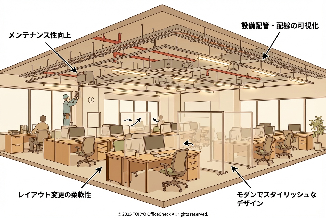 管理面でもメリットがあり、設備の点検やメンテナンスがしやすくなります。また、リノベーションにも柔軟に対応できる点が魅力です。配管や配線を活用した照明計画も自由度が高いため、デザイン性を高めたいオフィスやカフェなどでも人気です。