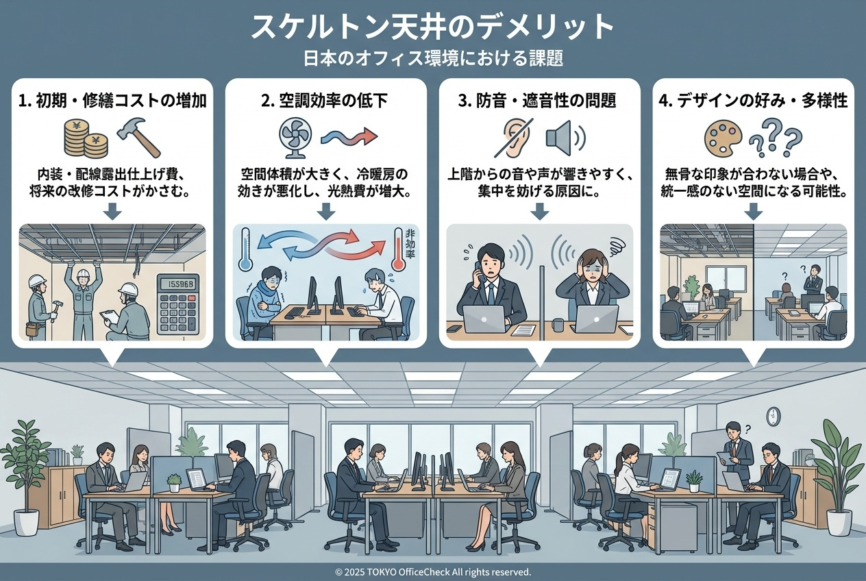 スケルトン天井には、コストや空調効率、遮音性など注意すべき課題も存在します。