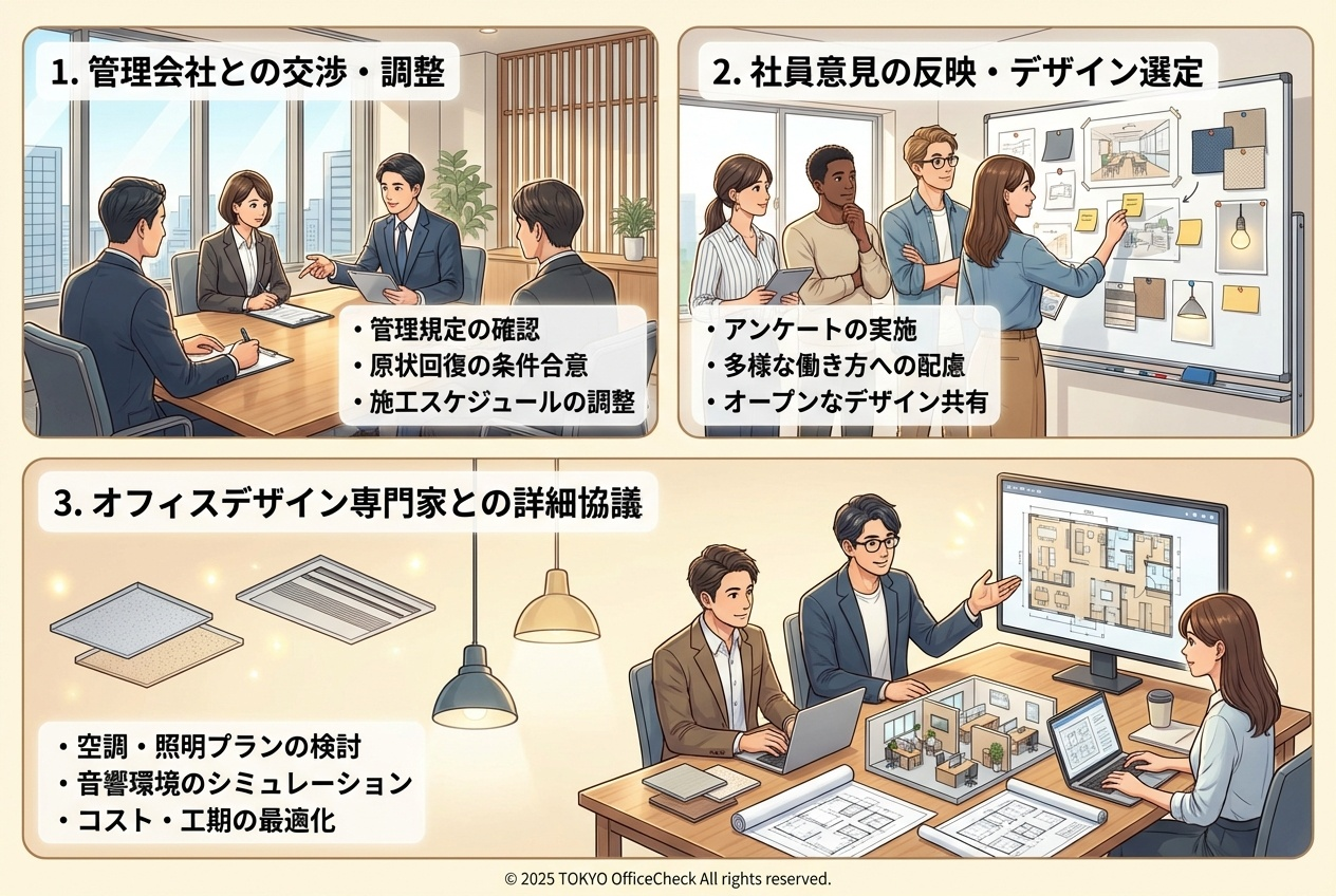 スケルトン天井の施工は、専門的な知識と経験を持った設計業者への相談が重要です。デザインや施工方法、配管や照明の配置など細部を丁寧に打ち合わせることで、仕上がりの質が大きく変わります。また、リノベーションや原状回復に必要な対応やコスト計算も、プロに任せれば安心です。疑問点や不安があれば、必ず現場調査と綿密な打ち合わせを行い、理想的なオフィス空間を実現しましょう。