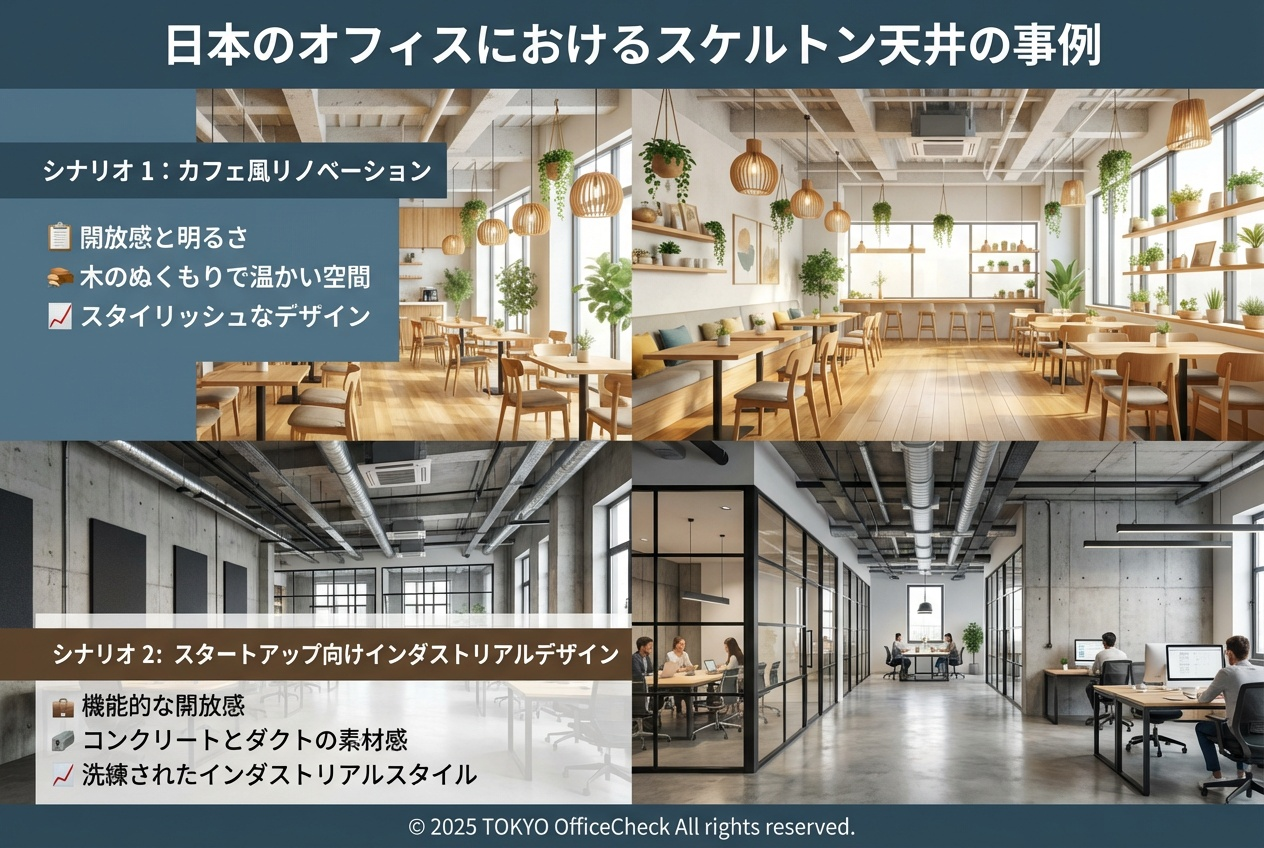 スケルトン天井は、カフェやオフィスの多様な内装事例で採用されています。