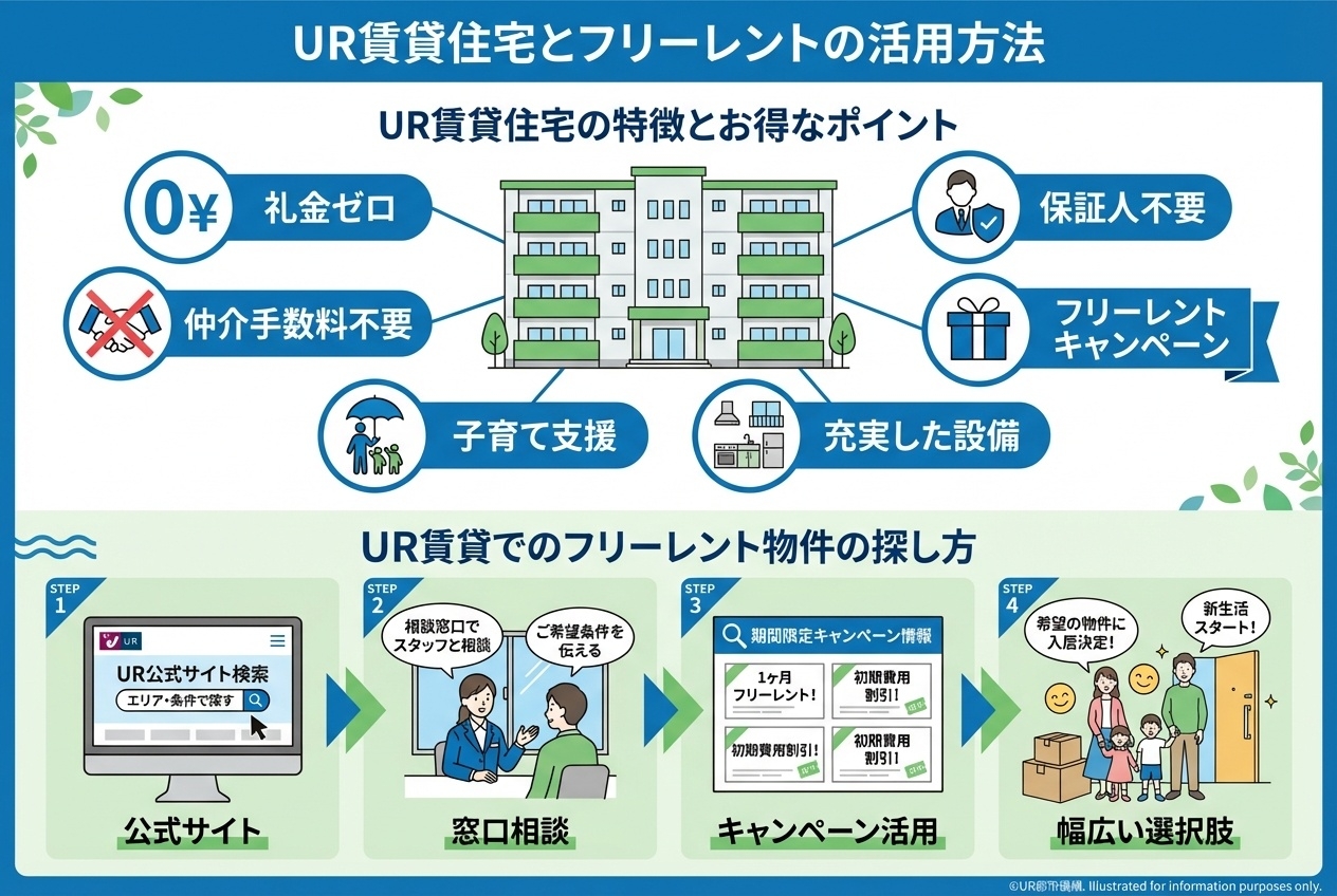 また、大家側が空室対策を強化する夏や秋、あるいは繁忙期以降は、家賃無料期間付き物件が増える傾向があります。UR賃貸住宅でもフリーレントのキャンペーンを実施しているため、公式サイトや店舗でタイミングをチェックしてください。