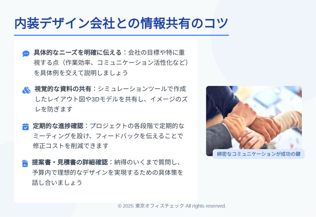 さらに、デザインの提案書や見積書を詳細に確認し、納得のいくまで質問をする姿勢が重要です。これにより、最適な内装デザインを実現できるだけでなく、予算内でプロジェクトを完了させることができます。正確な情報共有と綿密なコミュニケーションを通じて、理想的なオフィスレイアウトを実現しましょう。