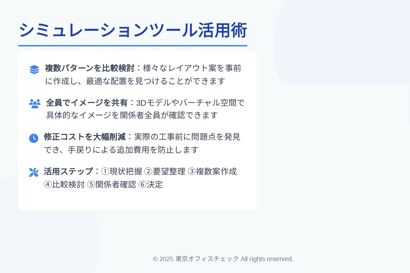 オフィス移転やリニューアルにおいて、シミュレーションは非常に重要です。現状のレイアウトや動線を見直し、最適な配置を検討することが成功の鍵となります。