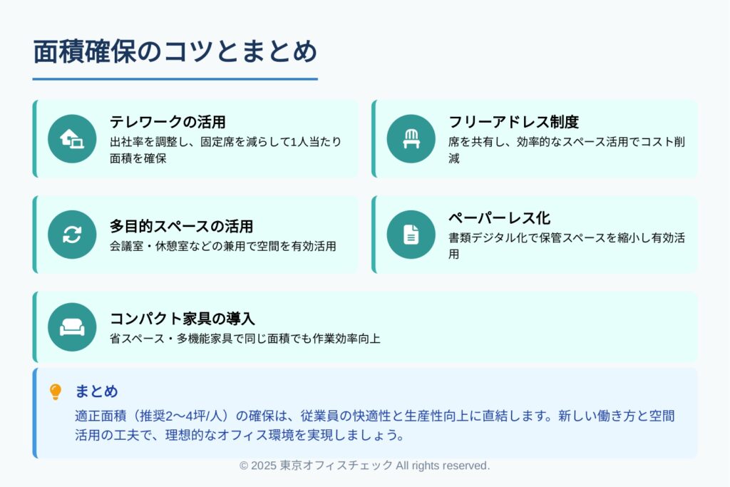 十分な1人当たりの面積を確保するためには、いくつかのコツを押さえておく必要があります。ここでは、十分な1人当たり面積を確保するコツを紹介します。