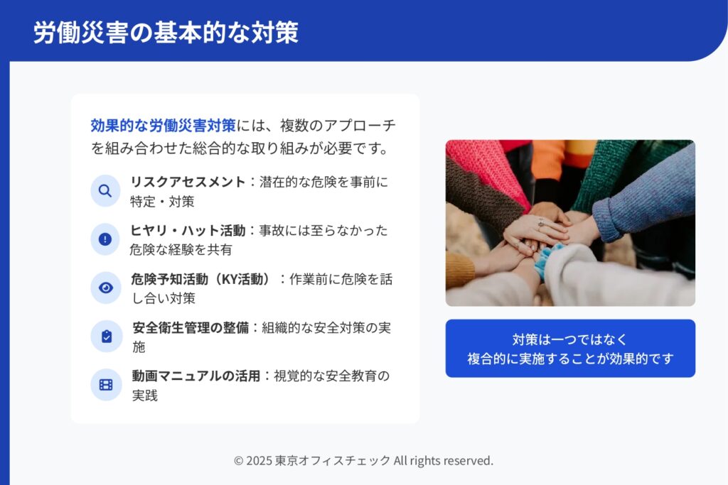 労働災害対策として、リスクアセスメントの実施やヒヤリ・ハット活動、危険予知活動(KY活動)が有効です。