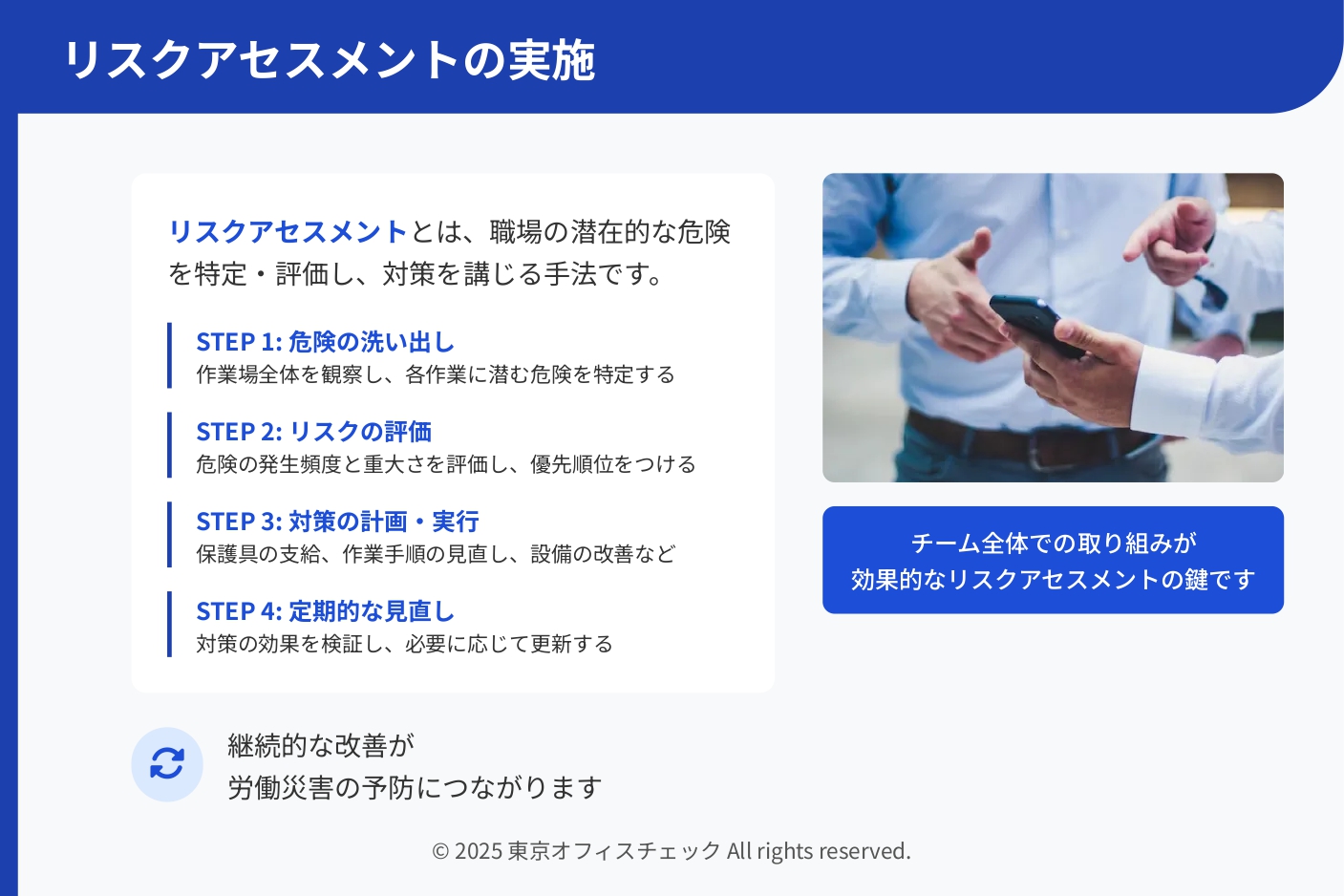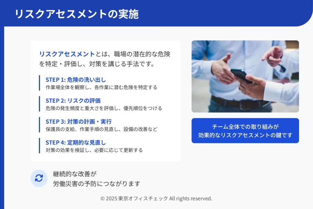 リスクアセスメントは、作業環境や作業手順を評価し、潜在的な危険を事前に特定・対策を講じる手法です。この手法により、企業は労働災害の発生率を大幅に低減できます。