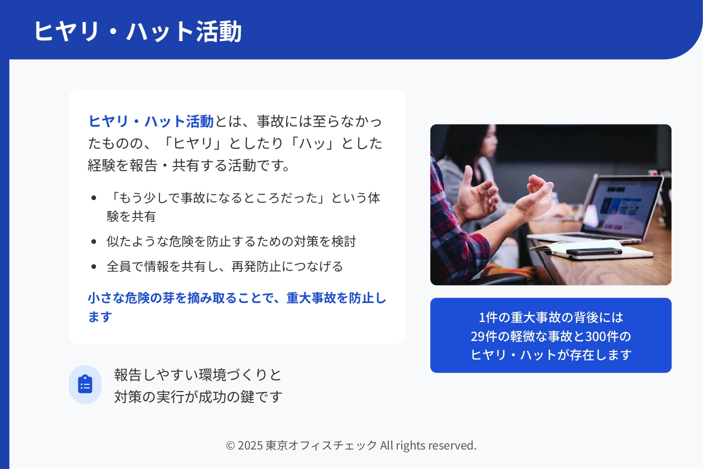 具体的には、作業中に発生した「もう少しで事故になりそうだった」状況を作業員が報告し、その情報を基に対策を講じます。報告された内容は分析され、同様の事例が他の現場でも起こらないように予防策が立案されます。この活動により、危険な作業環境や手順の改善が促進され、全体的な安全意識の向上が図られます。