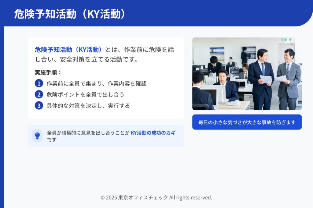 KY活動の具体的な手順は、まず作業を開始する前に全員が集まり、その日の作業内容や環境について話し合います。次に、考えられるリスクを洗い出し、その対策を検討・決定します。