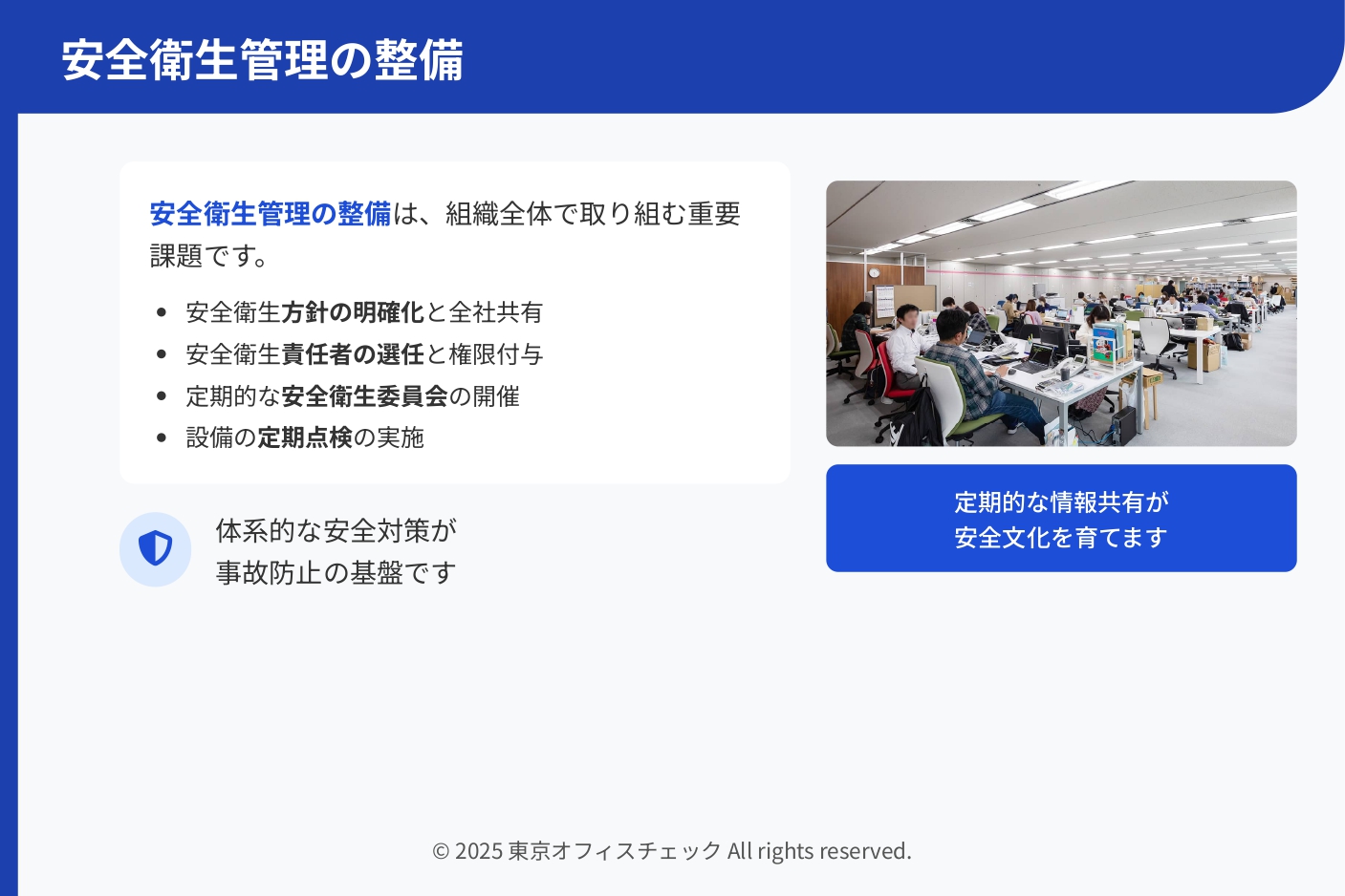 安全衛生管理の整備は、労働災害防止の基盤となる重要な項目です。これには、組織全体で安全衛生に関する方針を策定・実施し、定期的な見直しと改善を行うことが含まれます。