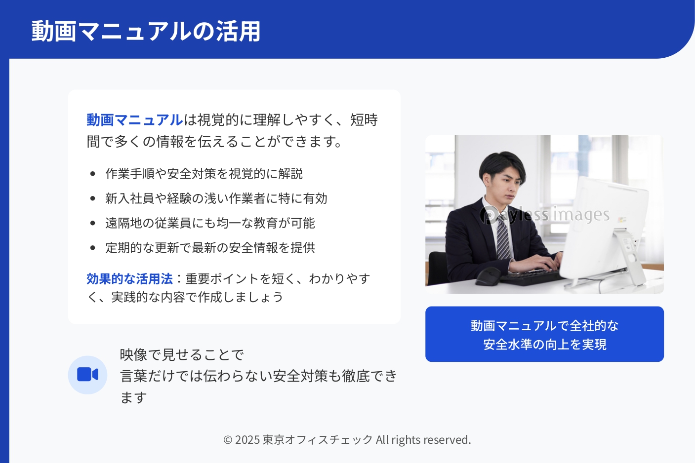 具体的には、作業手順や安全対策を動画で説明し、それを従業員に視聴させます。例えば、機械操作の際の注意点や正しい使用方法、安全装備の着用方法などを映像で示し、言葉だけでは伝わりにくい部分を視覚的に補います。