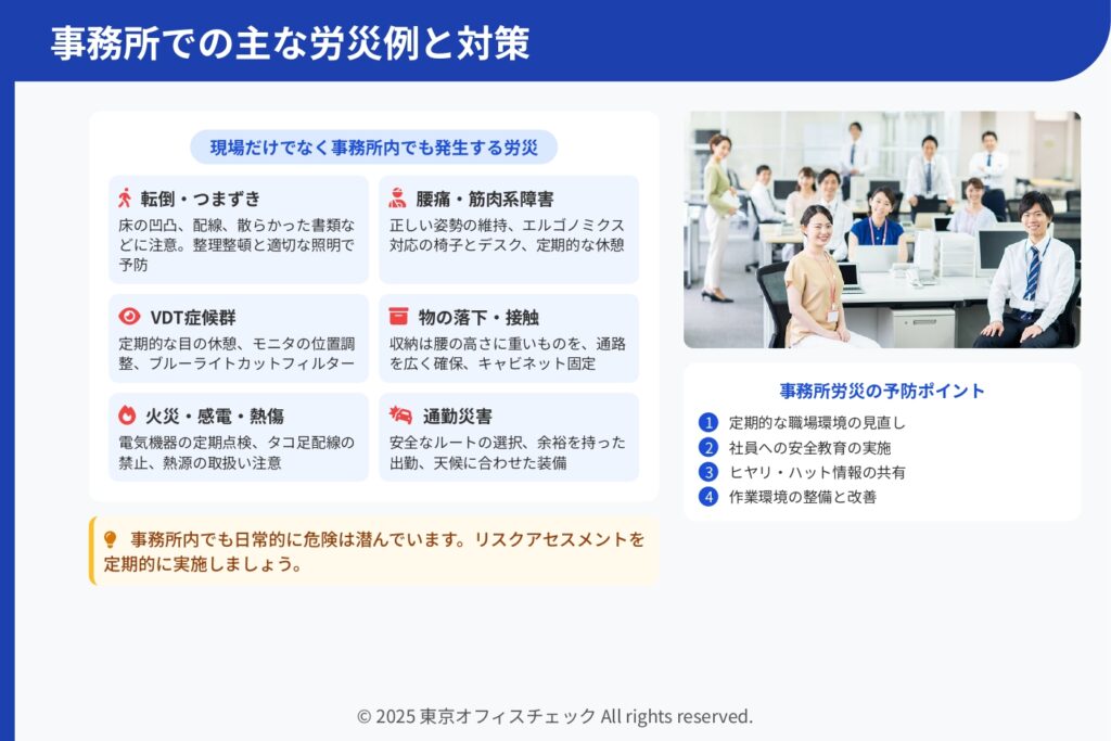 事務所での労災も発生する可能性があるため、対策が必要です。