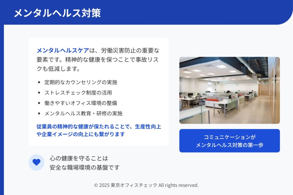 従業員のメンタルヘルス対策は、職場環境の一環として重要です。精神的な健康を保つことで、労働災害のリスクも低減できます。