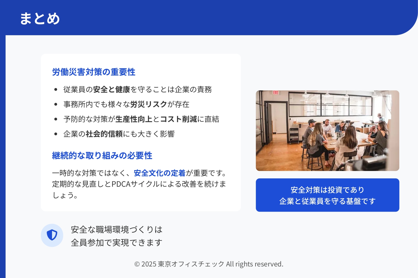 また、動画マニュアルの活用や従業員のメンタルヘルス対策も効果的です。これらの対策を実施することで、労働環境の改善だけでなく、法令遵守による企業の信頼性向上にも繋がります。特に事務所においては、転倒やつまずき、過重労働による腰痛、VDT症候群など、さまざまなリスクを考慮に入れた対策が必要です。