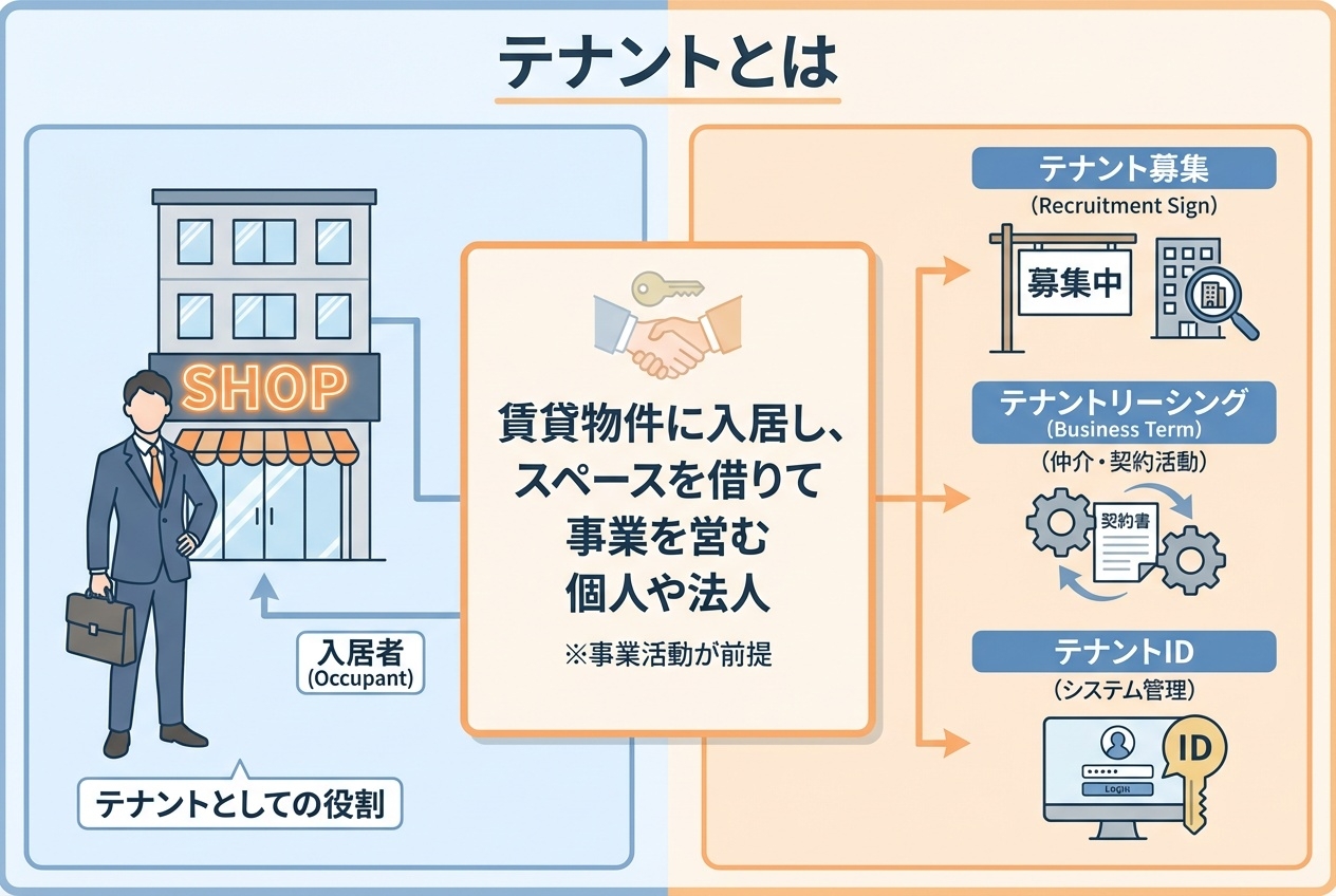 テナントとは、店舗やオフィスなどの賃貸物件に入居する利用者や事業者を指します。
