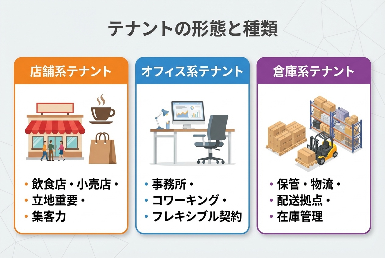 テナントには店舗系、オフィス系、倉庫系など様々な形態と種類があります。