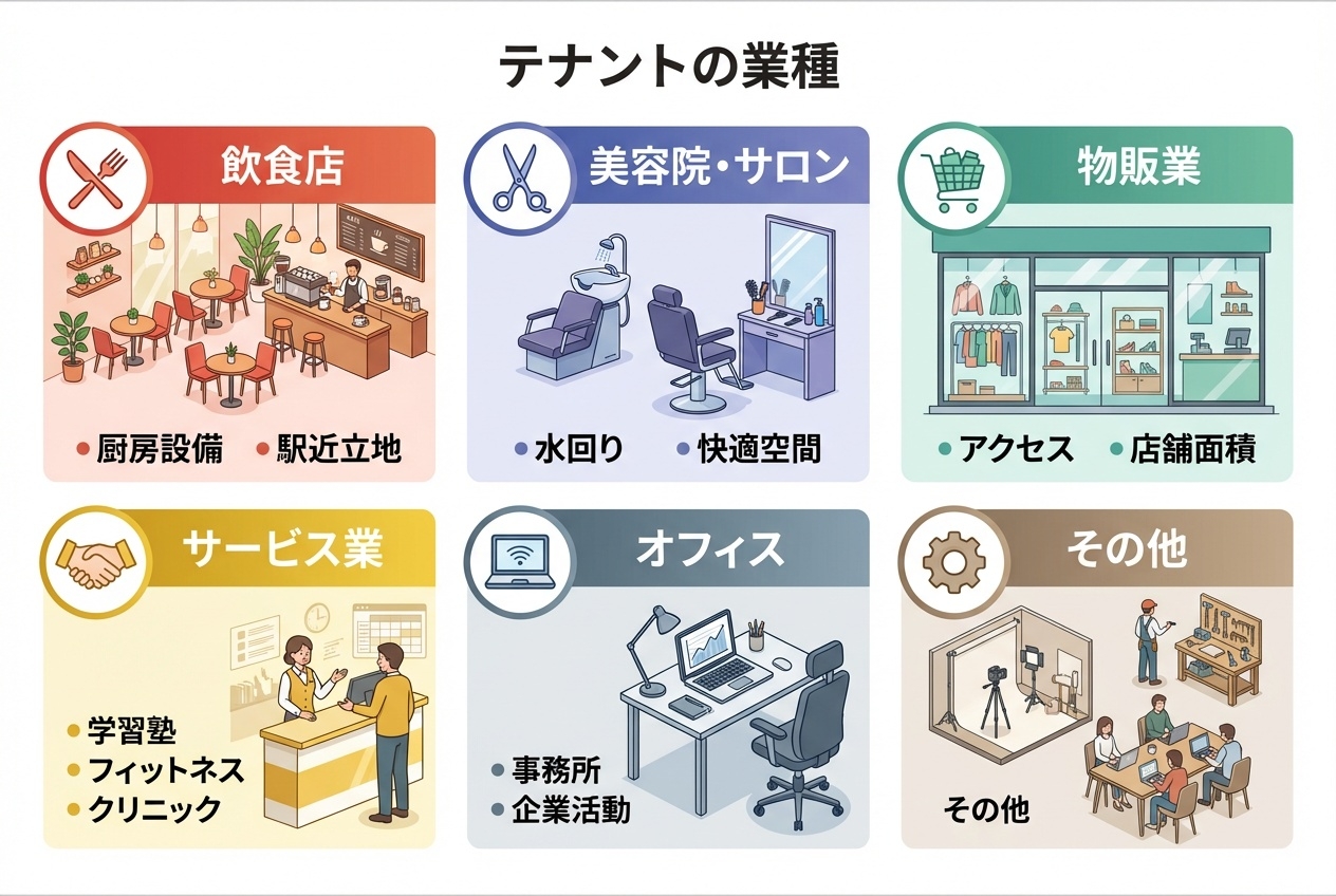 テナントの業種は主に飲食店、美容院・サロン、物販業、サービス業、オフィス、クリニックがあります。