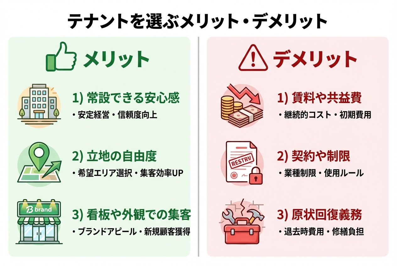 テナントを選ぶ際は、メリットとデメリットを把握して事業のリスク管理が大切です。