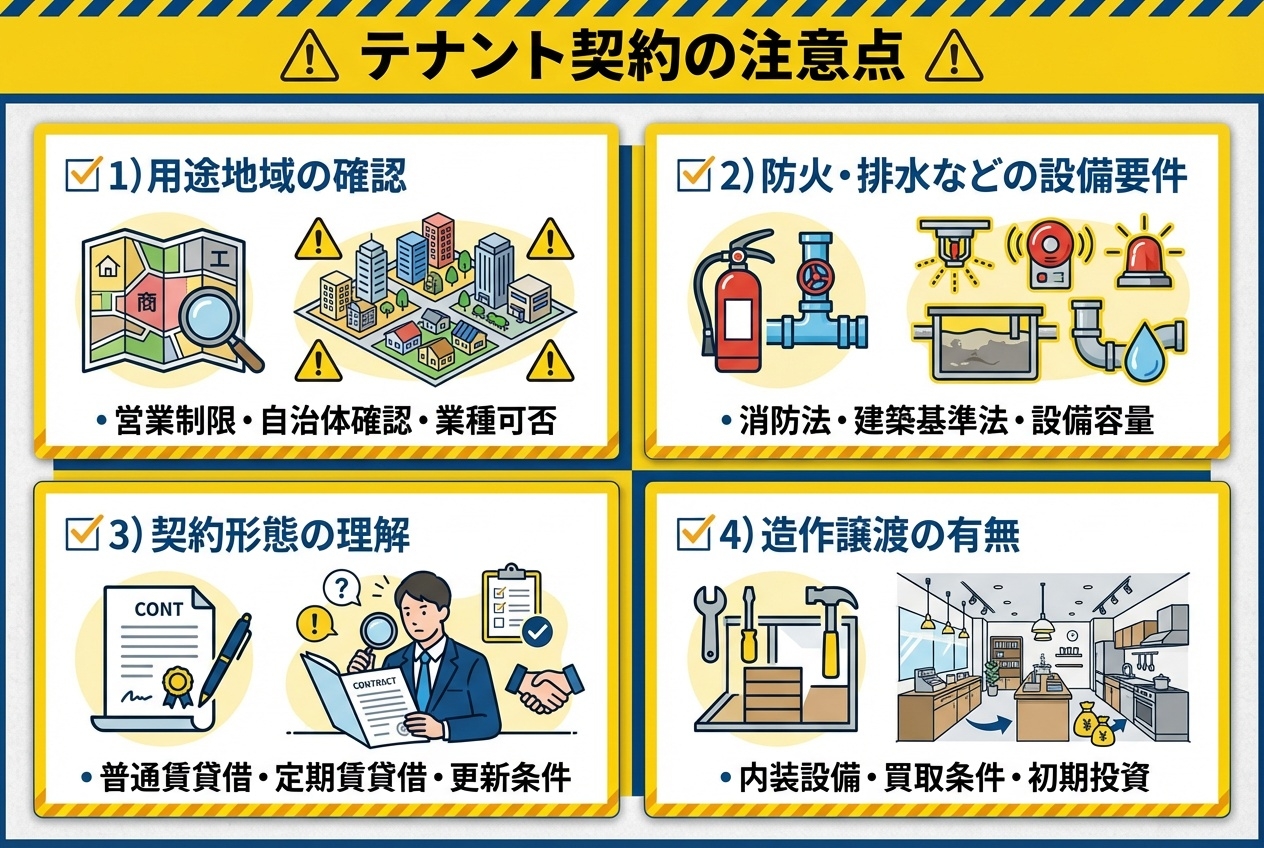 テナント契約では、用途地域や設備、契約形態など細かい確認が必要です。