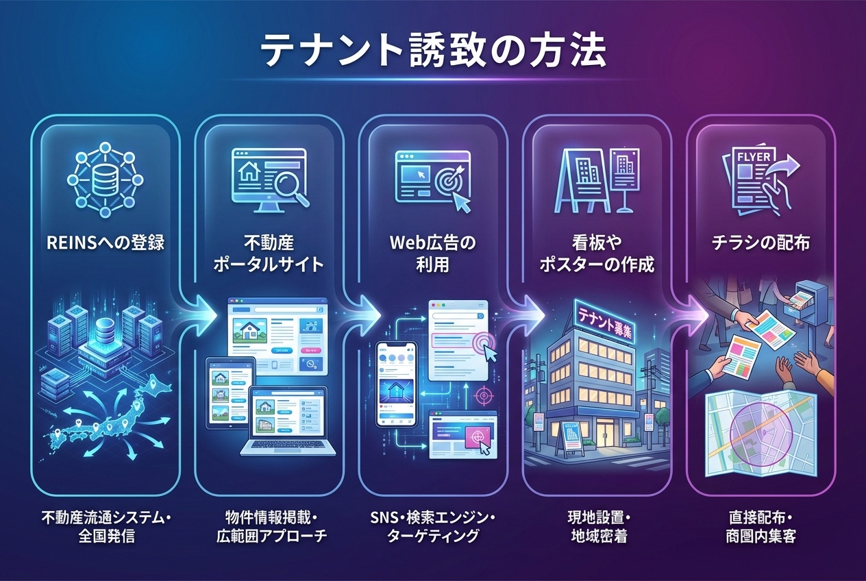 テナント誘致にはREINSやポータルサイト、広告・チラシ、看板やポスターの作成など複数の方法があります。