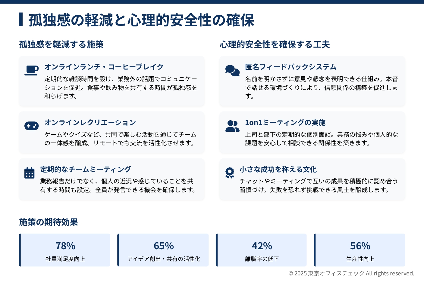 社員の孤独感を減らし、心理的安全性を保つことはチーム連携や生産性向上のために不可欠です。